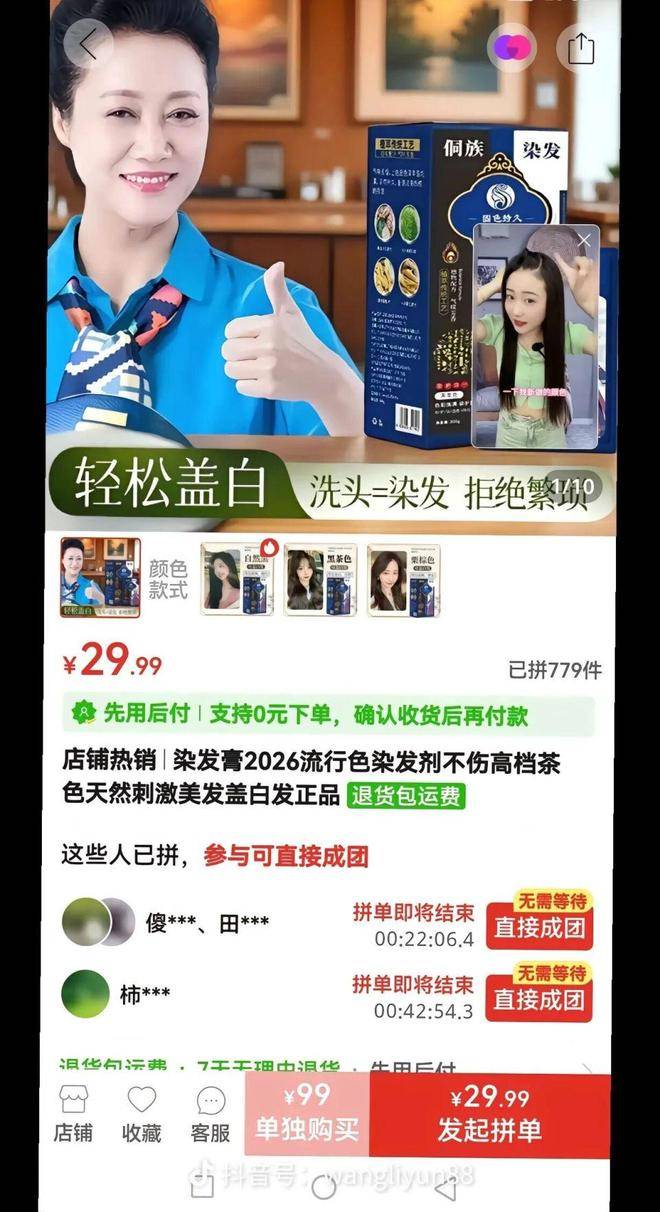 2月26日,经视直播的记者在某电商平台进行搜索,发现尽管部分染发产品已经撤下了原本带有王丽云照片的宣传图和视频,但在这些产品的文字简介中,依然标注着王丽云的名字。此外,还有一些商家采用了擦边球的方式,仍旧在宣传中借用了王丽云的名义进行推广。记者在另一电商平台的侗染护发造型旗舰店中发现,该店出售的侗染品牌染发膏宣传图上,使用了一张签名为王丽云的年轻女性形象。经过对比,记者发现这位年轻女性的衣着和动作,与王丽云曾因肖像侵权事件而被指控的照片几乎如出一辙。更为惊讶的是,商家还使用了一段疑似王丽云本人出镜的视频,视频标题中写着王丽云倾力推荐,亲测好用等字样。